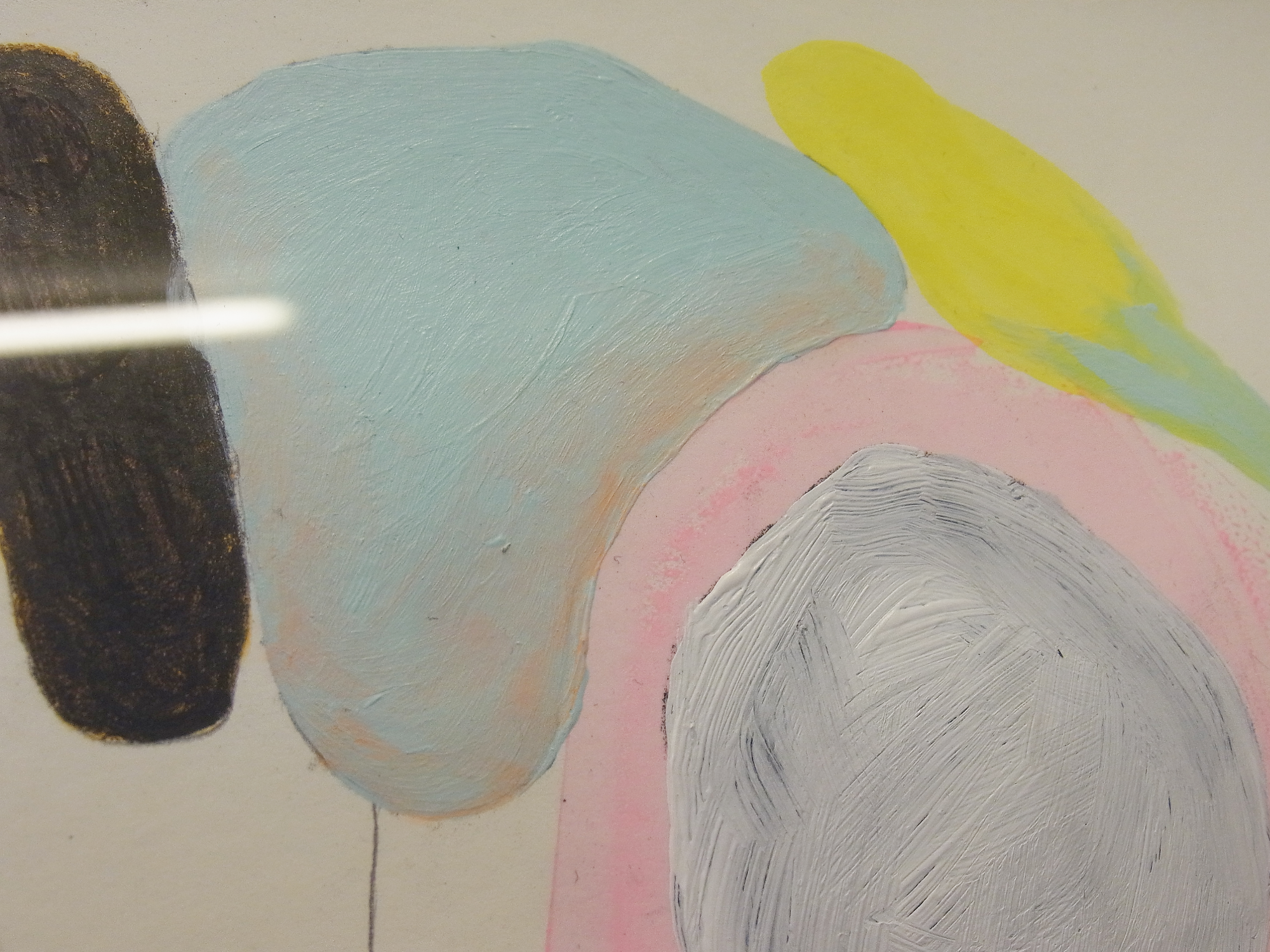 Dabei vermischen sich graphische Fomen mit malerischen Elementen, die